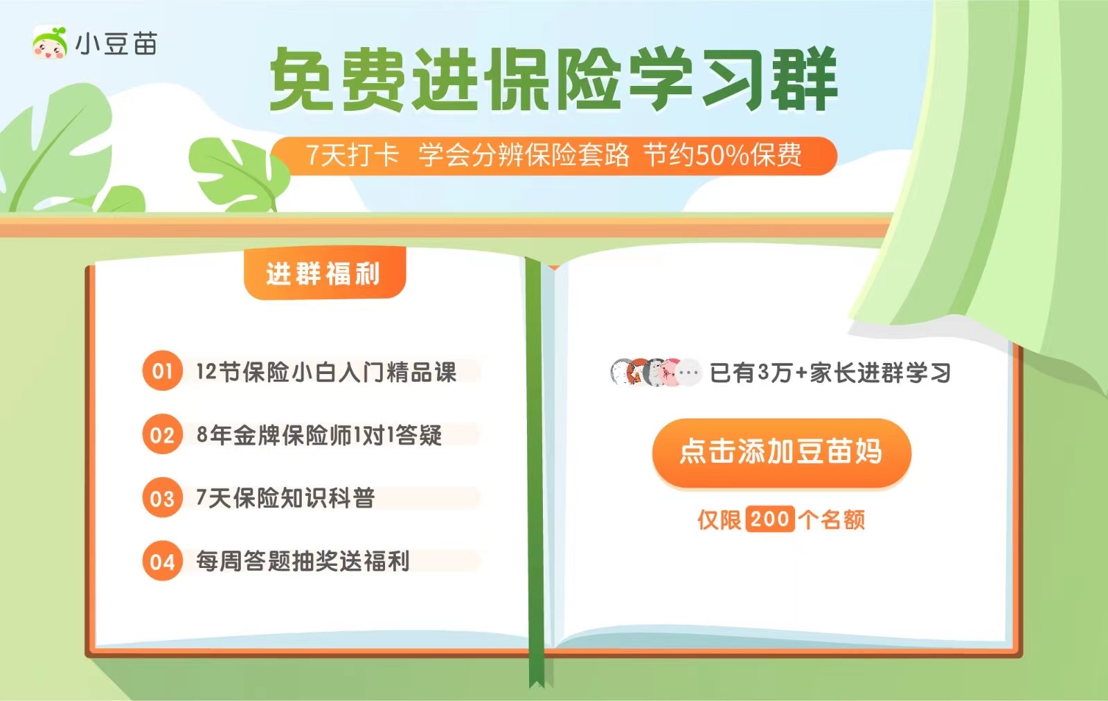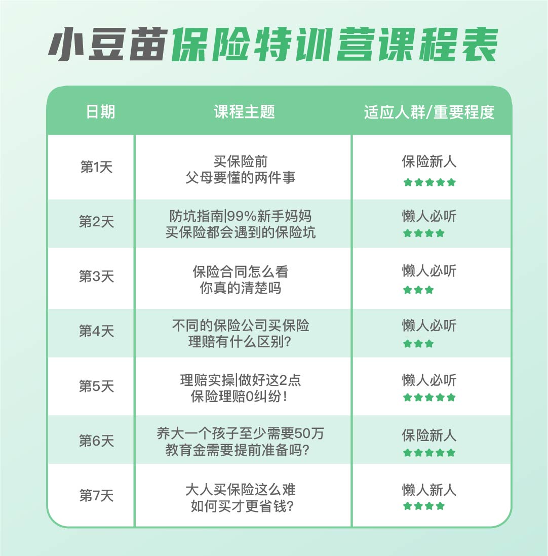 为了方便各位宝妈更直接地学习,豆苗妈特地办了保险特训营,手把手教大家学会用更少的钱,给孩子、家人买到合适的保险。